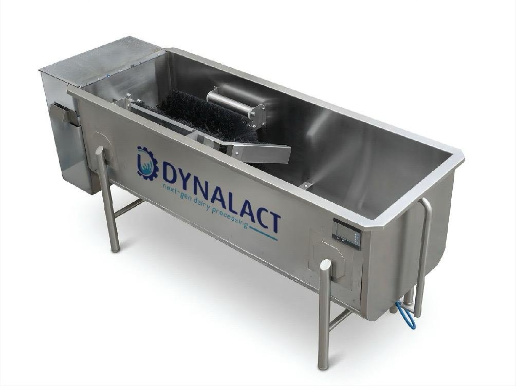 The system uses rotating brushes and water jets to remove milk residues and contaminants from cans.